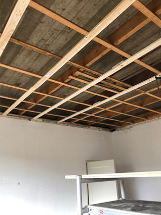 Slopen van de bestaande plafonds in de slaap- en badkamer. Opnieuw gipsplaten aanbrengen en het geheel netjes afstucen.